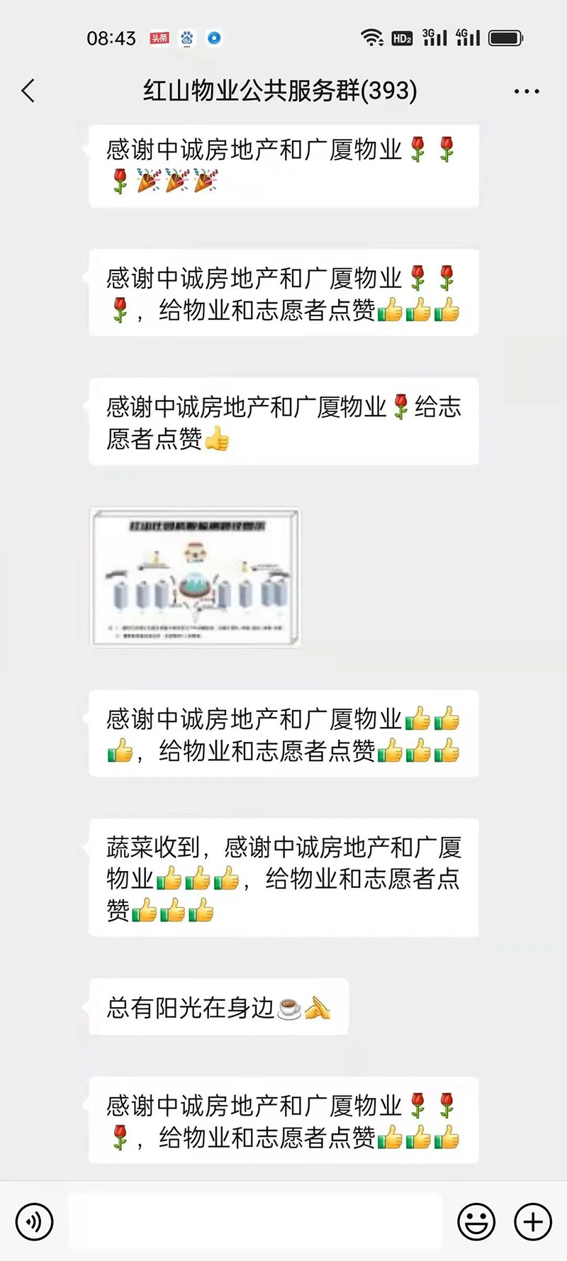 隨后,在社區志愿者的協助下,“愛心蔬菜包”安全順利地送到每一戶業主手中??粗鴺I主群里邊對中誠公司和廣廈物業持續刷屏的稱贊與感謝,每個人都忘記了辛苦,滿臉的汗水融化成了滿臉的笑容,那勒出紅印的雙手也成為了愛心的印記。